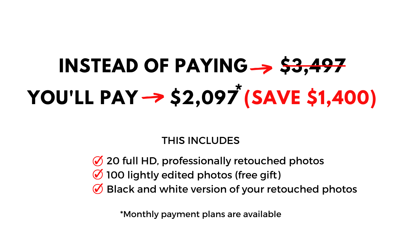 To be clear we do NOT have to do the shoot in October. You simply need to book your session before October 31st. I book up to 6 months out so if you aren’t quite ready yet, not to worry. You can book your session now, save $1400 and we can schedule your actual shoot for any time in the next 6 months.